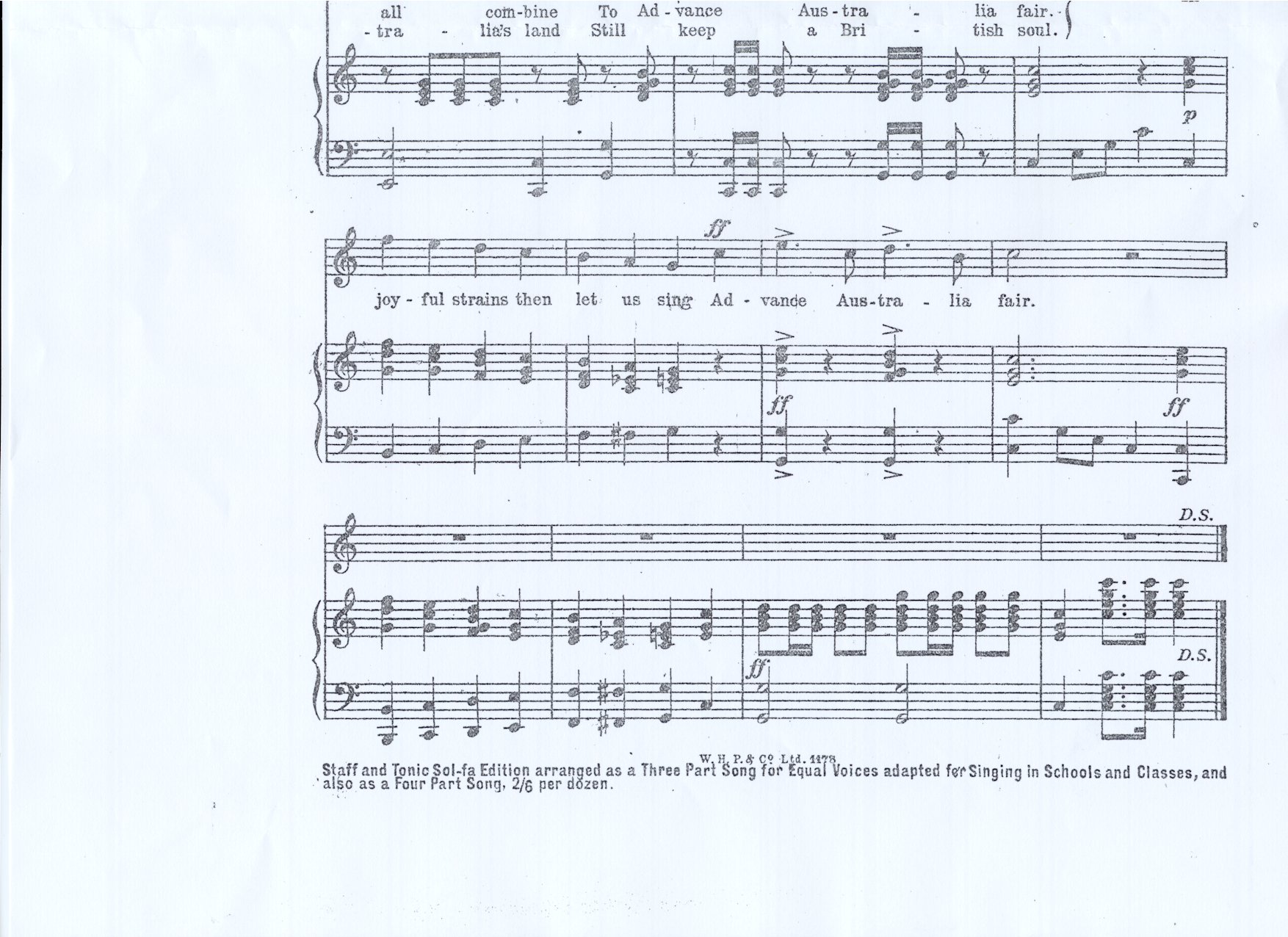 Scanned Images of Advance Australia Fair ~191x Sheet Music("Sung by the great choir of 10,000 voices at the inauguration of the Commonwealth. The first music performed by the massed bands after the naming of the Federal Capital of Australia, Canberra".)(Medium and High Resolution Images - 4 images)