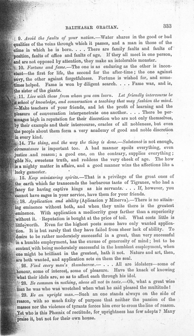 The above will give an idea of Gracian's method, and I now proceed to run through his maxims, translating none of the others in their entirety except the last, but giving, I trust, enough of them make some few people desire to possess the whole.