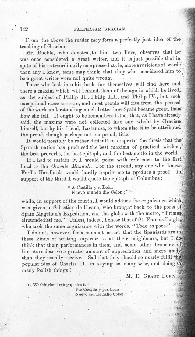 | Mr. (now Sir Mountstuart) Grant Duff's article on Balthasar Gracian in the Fortnightly Review of March 1877, VOL. XXI. N.S. page 228 - 342 as an Adobe PDF file of the JPG images |