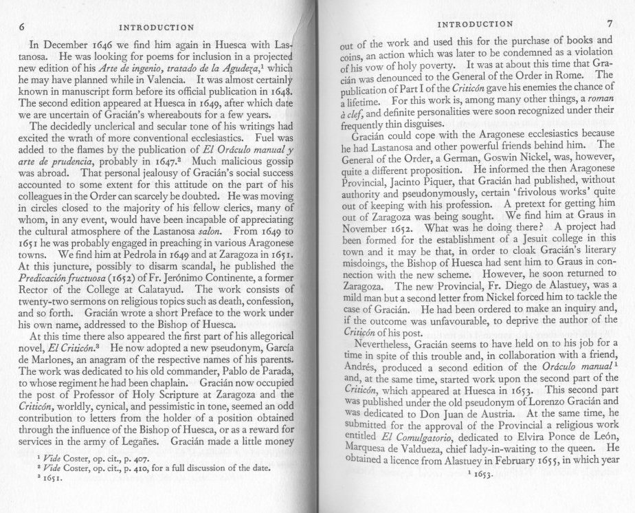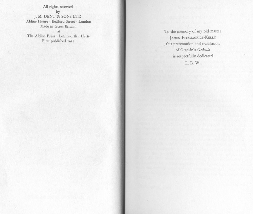 In the case of the present rendering, I have made certain changes in punctuation where English usage seemed to demand them. When the interests of tolerable English have obliged me to depart very considerably from the original, I have called attention to the fact in the Notes at the end of this volume. I should like to express my indebtedness to the Edinburgh University Carnegie Research Fund for a travelling grant which enabled me to visit the Biblioteca Nacional, Madrid, in connection with the preparation of this edition; to Professor Michael Grant of the Chair of Humanity at Edinburgh University for some interesting comments on the Latin of the Epitaph which appears at the foot of the portrait of Gracian at one time exhibited in the Jesuit College at Calatayud and which is now the property of Sefior D. Filix Sanz de Larrea; to Senor D. Jose Maria de Campoamor, Spanish Consul-General in London, for a transcription of the Epitaph and information as to the present ownership of the portrait; and to the Mercure de France for permission to reproduce the illustration of the portrait.