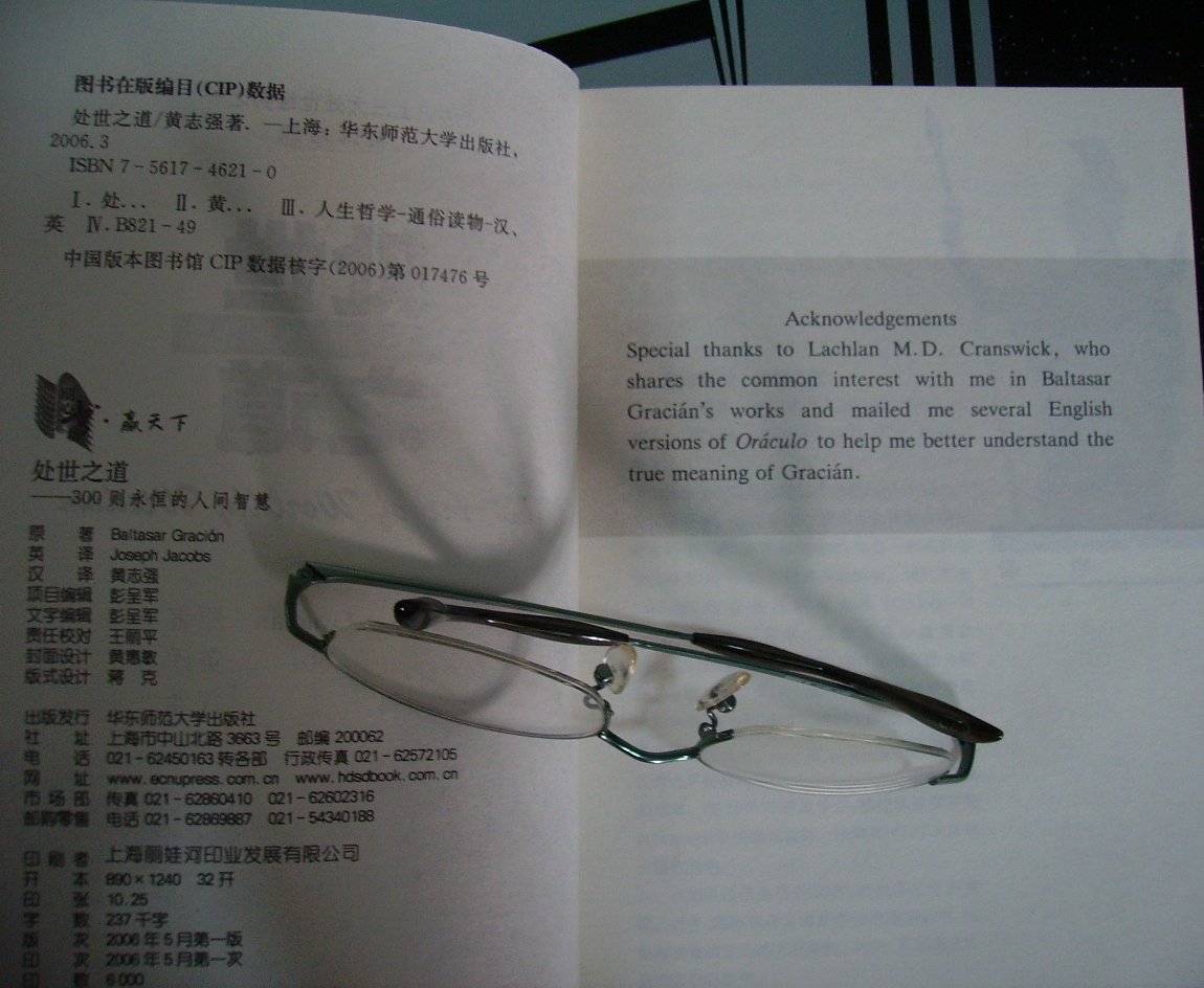A suggestion for people interested in other European language translations may be to check the Bibliographic Appendix to Martin Fischer's 1934 translation, and that in the L.B. Walton 1953 translation. Even though written in the 1930's and 1950's respectively, it may serve as a guide, especially for the German and French version. Until May 2006, there was a single Chinese language translation. But it is a translation of the Maurer 1991 English translation. Feedback received from one person who read it, and compared it to the Maurer text, gave a very negative review as to the quality and consistency of the translation. However, there is a newer May 2006 bilingual English-Chinese translation, based on using several of the English texts, by Hadrian Huang in Shanghai, ISBN is 7-5617-4621-0 (http://www.hdsdbook.com.cn/). It provides the English 1892 translation by Joseph Jacobs with the new Chinese translation. Screen dumps of the book cover and acknowledgements is below: Via Rastislav Telgarsky: a Polish translation is "Brewiarz Dyplomatyczny"; in English: Diplomatic Breviary (or, a "Reading for Diplomats") and in Slovak: Baltasar Gracian, Prirucne Orakulum Mudrosti, NESTOR, Bratislava 1998. (From Spanish original Oraculo manual y arte de prudencia, Catedra, Madrid, translated by PhDr. Martina Slezakova)