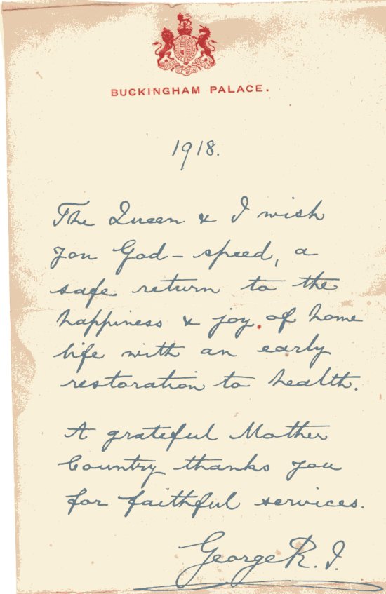A get well letter from the King, Buckingham Palace "Buckingham Palace 1918 The Queen and I wish you God-speed, a safe return to the happiness + joy of home life with an early restoration to health. A greatful Mother Country thanks you for faithful services. George R.I. |