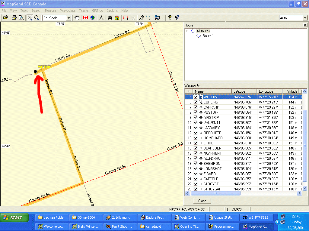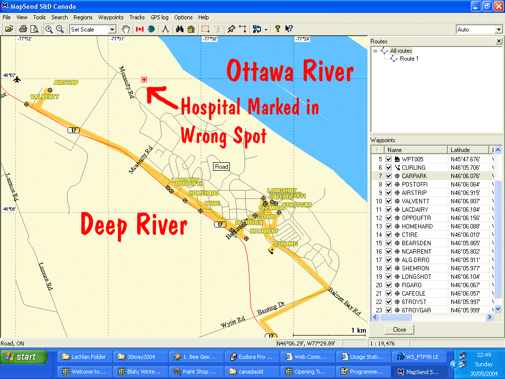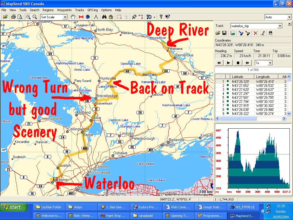 GPS Track from Waterloo to Deep River Ontario, and revisiting Webers Hamburgers (GPS: 44 deg, 42.602N ; 79 deg, 23.937 W) on Highway 11, Orillia - 30th May 2004