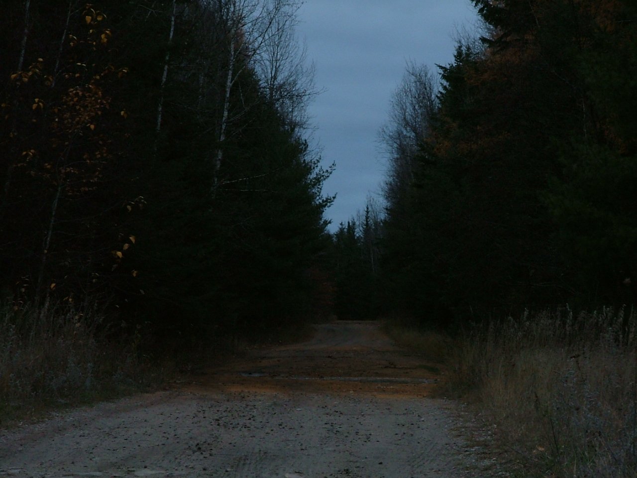 House for sale on other side of the tracks on Bass Lake Road Sign for distances to townships on Bass Lake Road Bass Lake Road at twilight