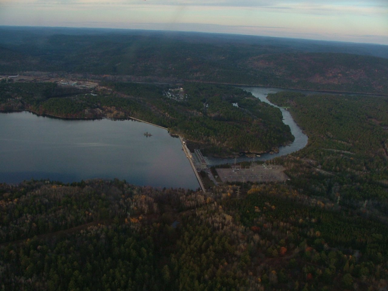 Old NPD nuclear power reactor in the distance viewed from the air Swisha Dam in the distance viewed from the air Swisha Dam in the distance viewed from the air Quebec side of the Ottawa River viewed from the air