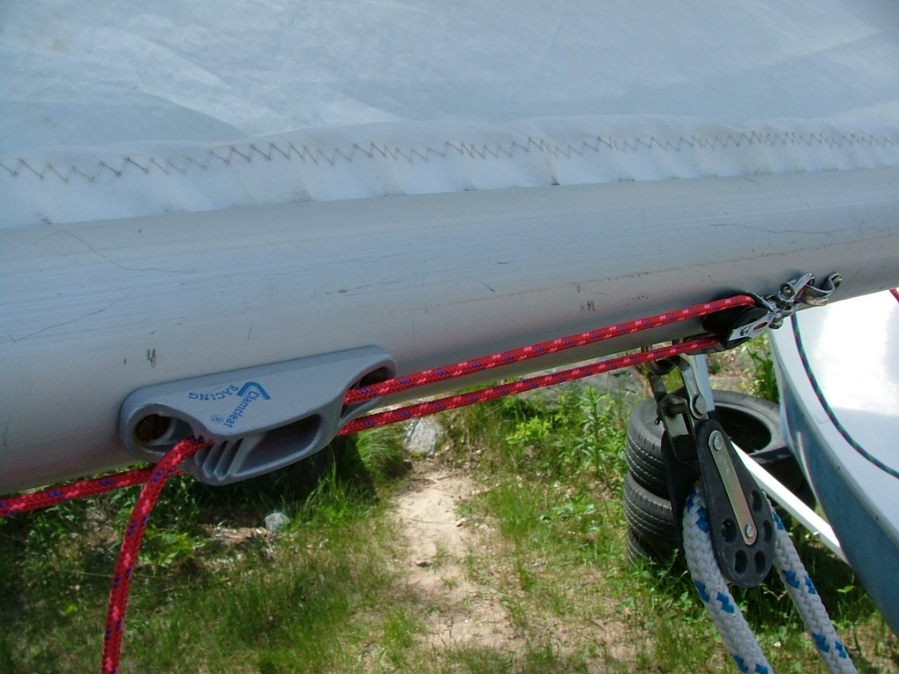 - Starboard Jib fairleads and cleats (rigged for single handed) and recovery line. The reason for jib cleats near the main sheet was a defunct setup (didn't work due to too much friction) for trying to release the jib without having to let go of the mainsheet: as letting go of the mainsheet while setting the jib is an easy cause of turtling the boat. Recovery line installed in case of capsize or turtling. Port and starboard jib sheets are different colours (blue and red).