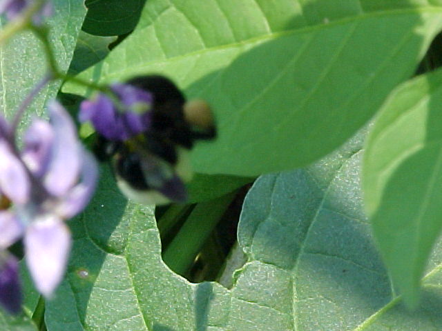 Bee, hassling metallic green insect and Bittersweet Nightshade; Climbing Nightshade; Deadly Nightshade (Solanum dulcamara) Blurred Bee and Bittersweet Nightshade; Climbing Nightshade; Deadly Nightshade (Solanum dulcamara)